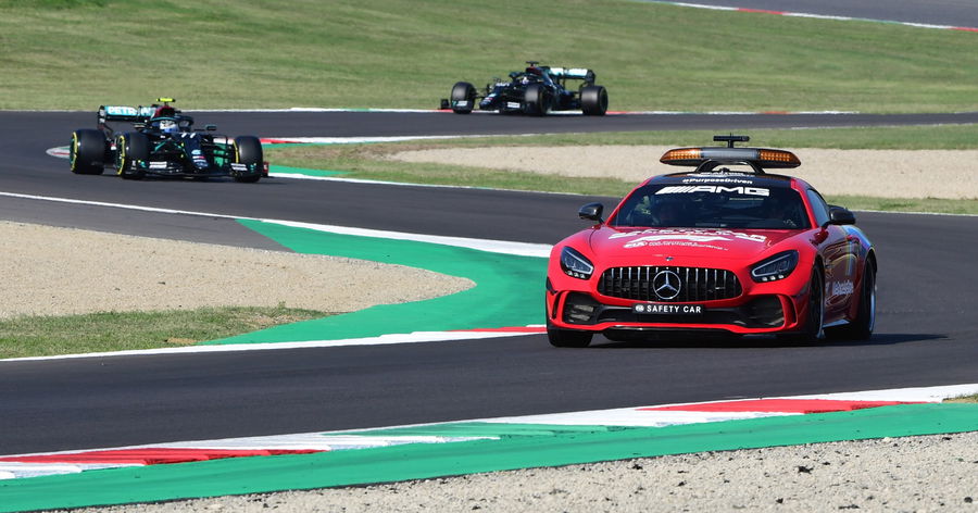 Formula One F1 – Tuscan Grand Prix – Mugello, Scarperia e San Piero, Italy – September 13, 2020, Mercedes’ Valtteri Bottas and Mercedes’ Lewis Hamilton behind the safety car during the race | Courtesy: Pool via REUTERS/Jennifer Lorenzini