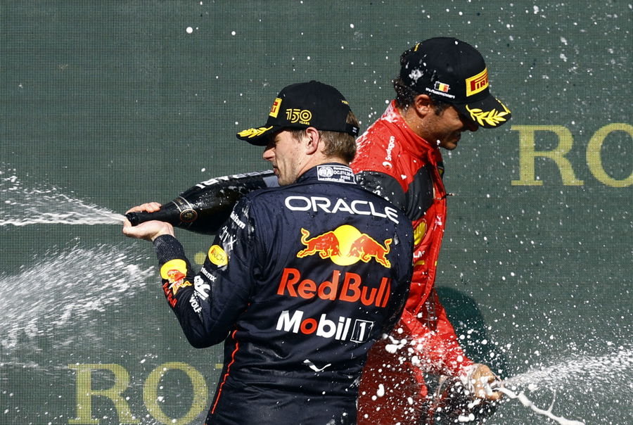 Formula One F1 – Belgian Grand Prix – Spa-Francorchamps, Spa, Belgium – August 28, 2022 Red Bull’s Max Verstappen celebrates on the podium after winning the Belgian Grand Prix with third placed Ferrari’s Carlos Sainz Jr. REUTERS/Stephane Mahe