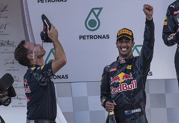 Red Bull Racing’s Australian driver Daniel Ricciardo celebrates his victory as Red Bull team principal Christian Horner drinks champagne from Ricciardos’ shoe on the podium during the Formula One Malaysian Grand Prix in Sepang on October 2, 2016. / AFP PHOTO / PEDRO UGARTE