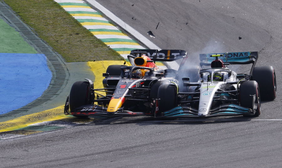 Formula One F1 – Brazilian Grand Prix – Jose Carlos Pace Circuit, Sao Paulo, Brazil – November 13, 2022 Red Bull’s Max Verstappen collides with Mercedes’ Lewis Hamilton during the race REUTERS/Amanda Perobelli