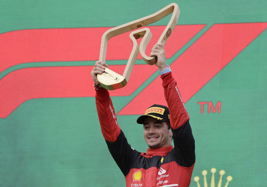 Formula One F1 – Austrian Grand Prix – Red Bull Ring, Spielberg, Austria – July 10, 2022 Ferrari’s Charles Leclerc celebrates on the podium after winning the Austrian Grand Prix REUTERS/Leonhard Foeger