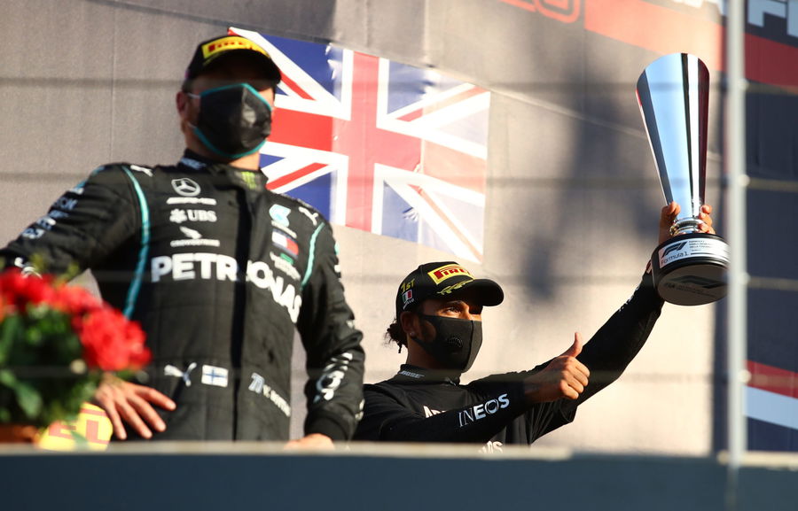 Formula One F1 – Tuscan Grand Prix – Mugello, Scarperia e San Piero, Italy – Mercedes’ Lewis Hamilton celebrates with the trophy on the podium after winning the race alongside Mercedes’ Valtteri Bottas Pool via REUTERS/Bryn Lennon