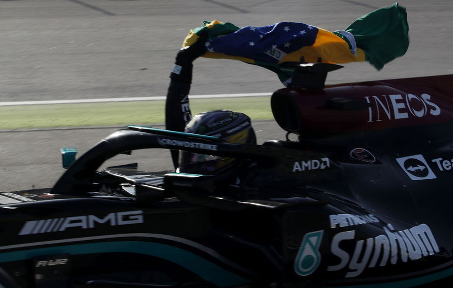 Formula One F1 – Brazilian Grand Prix – Jose Carlos Pace Circuit, Sao Paulo, Brazil – November 14, 2021. Mercedes’ Lewis Hamilton celebrates winning the race REUTERS/Amanda Perobelli.