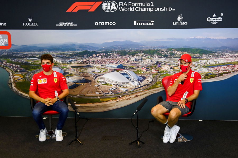 Formula One F1 – Russian Grand Prix – Sochi Autodrom, Sochi, Russia – Ferrari’s Sebastian Vettel and Charles Leclerc during the press conference FIA/Handout via REUTERS