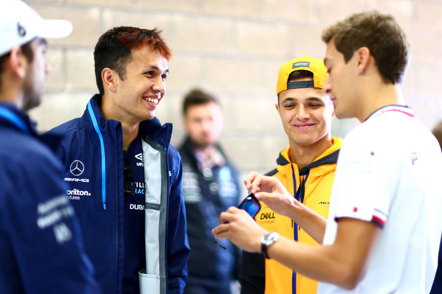 SPA, BELGIUM – AUGUST 28: Nicholas Latifi of Canada and Williams, Alexander Albon of Thailand and Williams, Lando Norris of Great Britain and McLaren and George Russell of Great Britain and Mercedes talk prior to the F1 Grand Prix of Belgium at Circuit de Spa-Francorchamps on August 28, 2022 in Spa, Belgium. (Photo by Dan Istitene – Formula 1/Formula 1 via Getty Images)