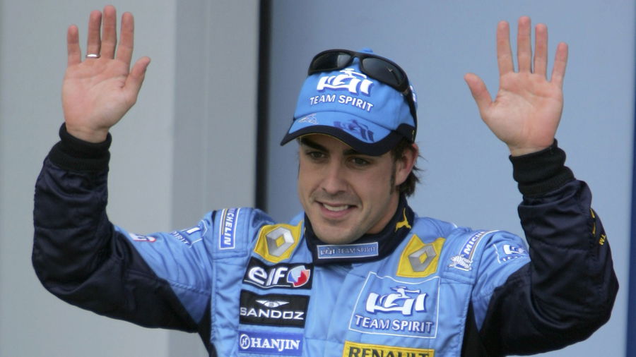 NURBURG, GERMANY – MAY 06: Fernando Alonso of Spain and Renault celebrates pole position during qualifying for the European F1 Grand Prix at the Nurburgring on May 5, 2006, in Nurburg, Germany. (Photo by Clive Rose/Getty Images)