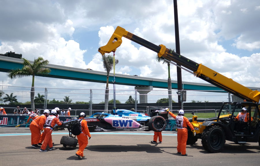 Formula One F1 – Miami Grand Prix – Miami International Autodrome, Miami, Florida, U.S. – May 7, 2022 Alpine’s Esteban Ocon’s car is towed away during practice REUTERS/Ricardo Arduengo