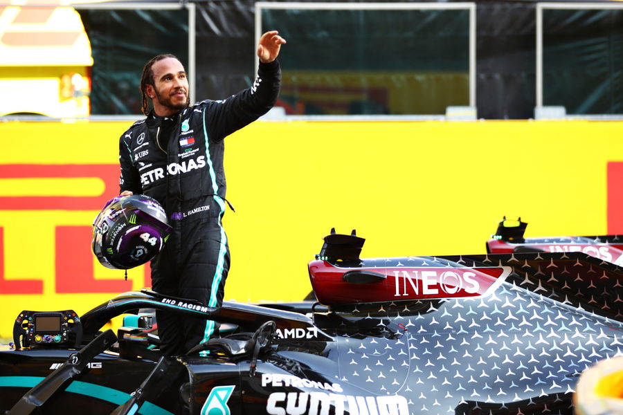 SCARPERIA, ITALY – SEPTEMBER 13: Race winner Lewis Hamilton of Great Britain and Mercedes GP celebrates in parc ferme during the F1 Grand Prix of Tuscany at Mugello Circuit on September 13, 2020 in Scarperia, Italy. (Photo by Mark Thompson/Getty Images)