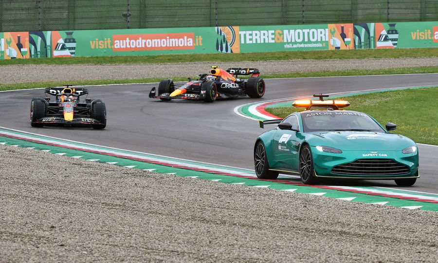 Formula One F1 – Emilia Romagna Grand Prix – Autodromo Enzo e Dino Ferrari, Imola, Italy – April 24, 2022 General view of Red Bull’s Max Verstappen and Red Bull’s Sergio Perez during the race while the safety car is out REUTERS/Jennifer Lorenzini