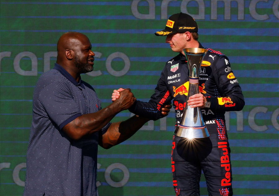 Formula One F1 – United States Grand Prix – Circuit of the Americas, Austin, Texas, U.S. – October 24, 2021 American former professional basketball player Shaquille O’Neal presents the winner trophy to Red Bull’s Max Verstappen on the podium REUTERS/Brian Snyder