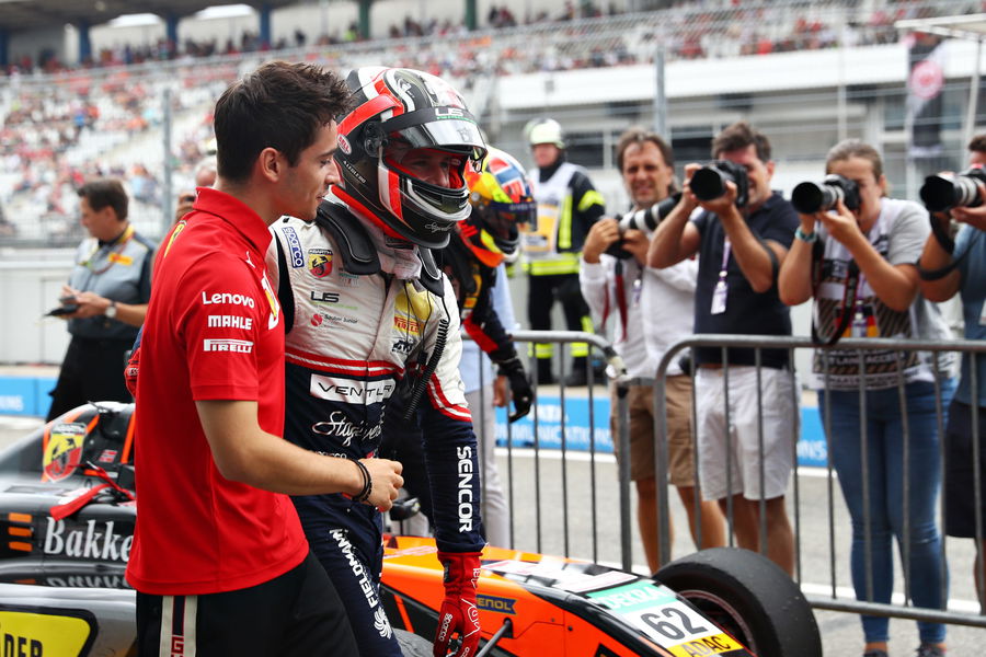 HOCKENHEIM, GERMANY – JULY 28: Charles Leclerc of Monaco and Ferrari celebrates after his brother, Arthur Leclerc, won the F4 race before the F1 Grand Prix of Germany at Hockenheimring on July 28, 2019 in Hockenheim, Germany. (Photo by Lars Baron/Getty Images)