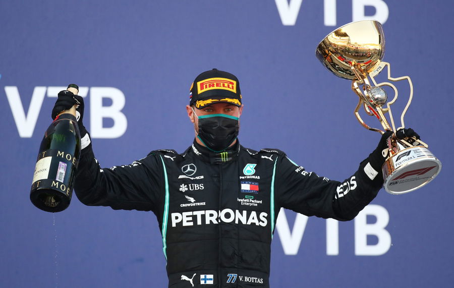 Formula One F1 – Russian Grand Prix – Sochi Autodrom, Sochi, Russia – Mercedes’ Valtteri Bottas celebrates with the trophy on the podium after winning the race. Pool via REUTERS/Bryn Lennon
