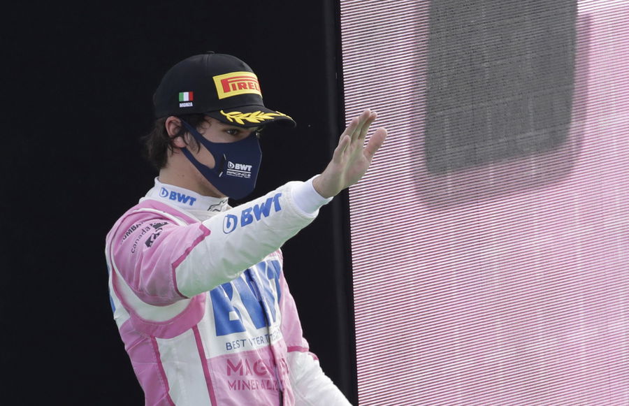 Racing Point’s Lance Stroll celebrates finishing third in the Italian Grand Prix Pool via REUTERS/Luca Bruno