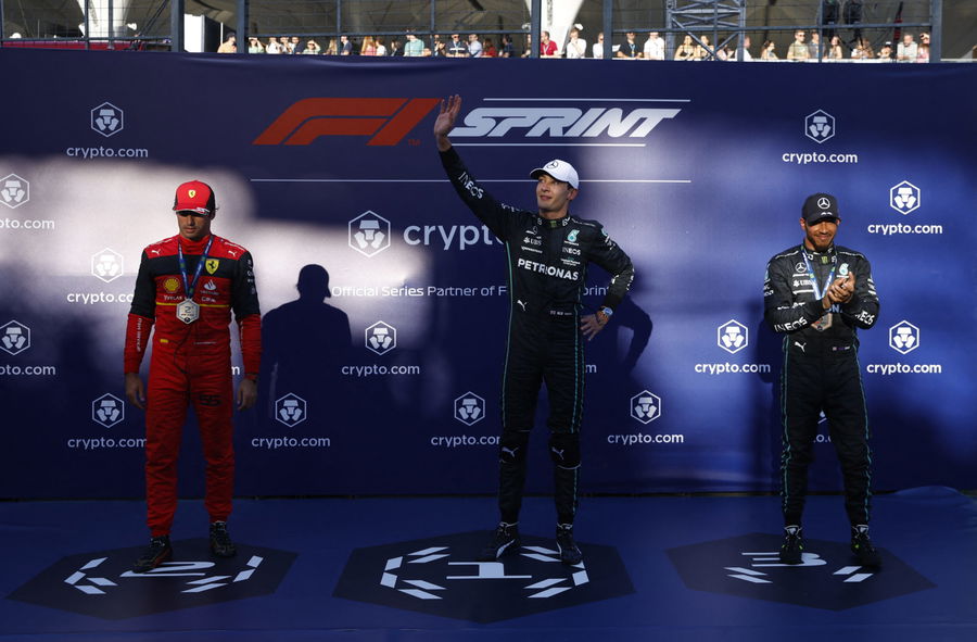 Formula One F1 – Brazilian Grand Prix – Jose Carlos Pace Circuit, Sao Paulo, Brazil – November 12, 2022 Mercedes’ George Russell celebrates during the presentation after finishing in pole position in sprint qualifying alongside second placed Ferrari’s Carlos Sainz Jr. and third placed Mercedes’ Lewis Hamilton REUTERS/Amanda Perobelli