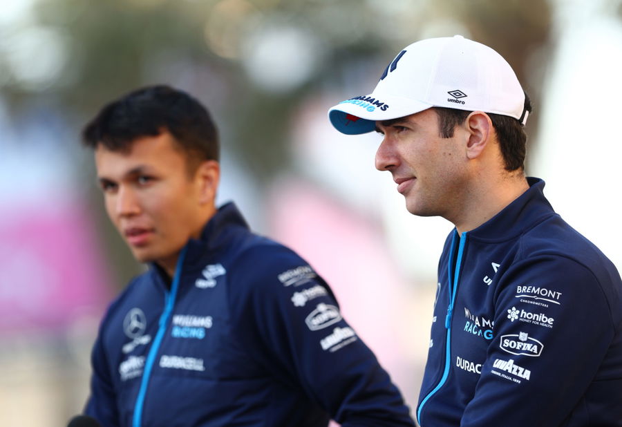 BAHRAIN, BAHRAIN – MARCH 17: Nicholas Latifi of Canada and Williams and Alexander Albon of Thailand and Williams talk to the media in the Paddock during previews ahead of the F1 Grand Prix of Bahrain at Bahrain International Circuit on March 17, 2022, in Bahrain, Bahrain. (Photo by Clive Rose – Formula 1/Formula 1 via Getty Images)