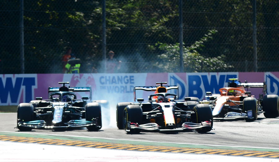 Formula One F1 – Italian Grand Prix – Autodromo Nazionale Monza, Monza, Italy – September 12, 2021 Mercedes’ Lewis Hamilton in action with Red Bull’s Max Verstappen during the race REUTERS/Massimo Pinca