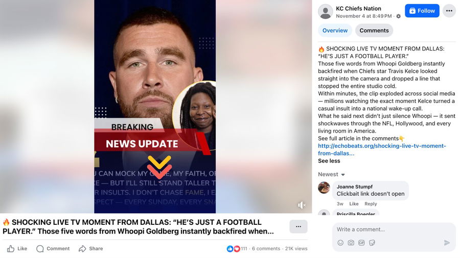 Later on November 4, “KC Chiefs Nation,” a Facebook community of about 29k followers and self-described as “the ultimate fan page for Kansas City Chiefs enthusiasts,” posted another version of the story, swapping in Travis Kelce’s name while maintaining the false narrative. That post garnered 21k views.