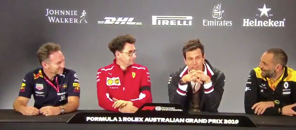 During the Friday pre-race press conference, exclusively for the team bosses, the question was again pitched. Attending this season were Christian Horner, Mattia Binotto, Toto Wolff and Cyril Abiteboul in that order.