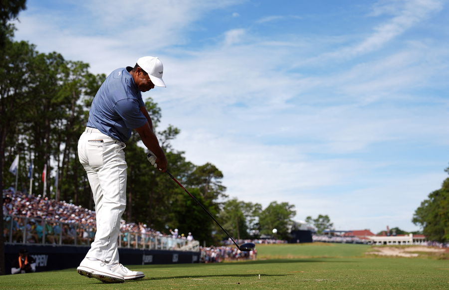 Jun 10, 2024; Pinehurst, North Carolina, USA; Tiger Woods tees off on the 18th hole during a practice round for the U.S. Open golf tournament at Pinehurst No. 2. Mandatory Credit: Katie Goodale-USA TODAY Sports