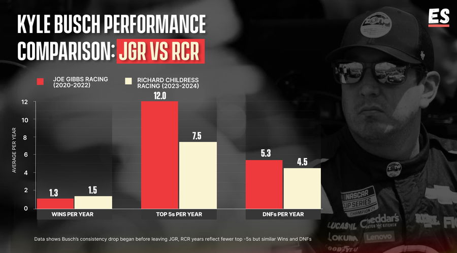 Results have been hard to come by for Kyle Busch at Richard Childress Racing, with just three wins in the No. 8 Chevy in nearly 100 races. Sure, there have been flashes of potential, but not the kind of return to form many expected. And while many have blamed Richard Childress Racing for Busch’s ‘downfall’ in recent years, that story is far more complicated.