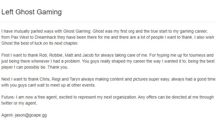 “I am officially parting ways with Ghost Gaming on good terms. Ghost was the first and only organization I’ve been on and I’ve learned so much over the last 2 years.