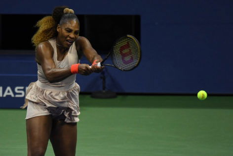 Sep 10 2020; Flushing Meadows, New York,USA; Serena Williams of the United States hits a backhand in a women’s singles semi-finals match on day ten of the 2020 U.S. Open tennis tournament at USTA Billie Jean King National Tennis Center. Mandatory Credit: Danielle Parhizkaran-USA TODAY Sports