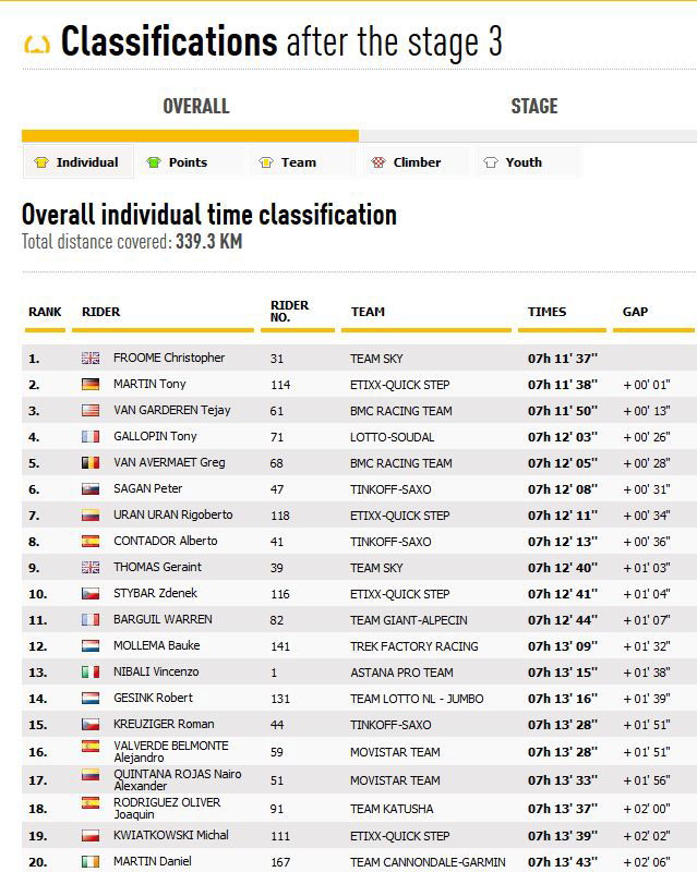 General Classification after Stage 3. image courtesy of Tour De France website.