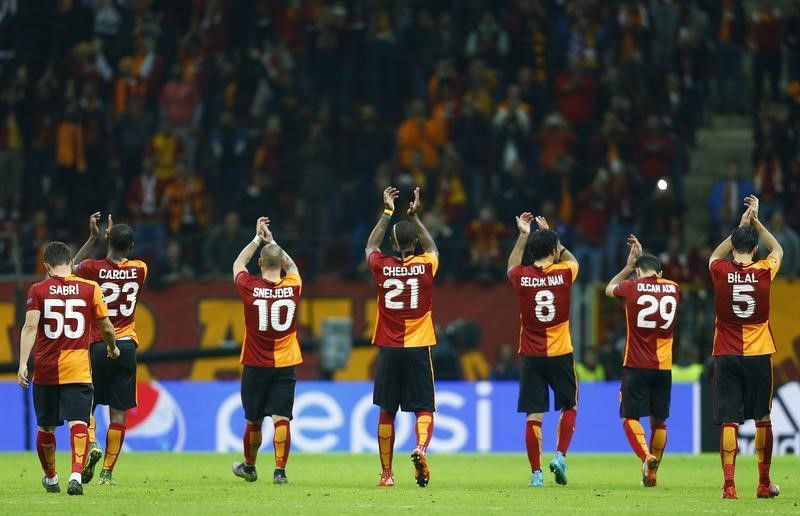 Galatasaray’s players celebrate winning their Champions League Group C soccer match against Benfica at the Ali Sami Yen stadium in Istanbul, Turkey, October 21, 2015. REUTERS/Osman Orsal