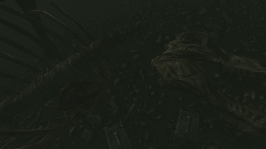 Off the shore in Point Lookout, a submerged T-Rex skeleton rests on the seabed. This skeleton is accompanied by a human skeleton, two ammunition boxes, and a locked safe.