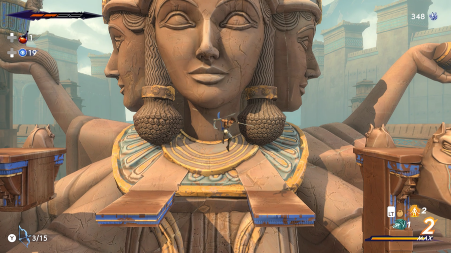 Now this does not make parrying an instant kill easy mode for the game. Enemies get harder and harder to parry as the game advances, and this game has no shortage of enemies to combat either, so keeping a close eye on those signs of when one should parry becomes increasingly necessary. There’s also a slide mechanic that players use with RT or R2. They can slide from under the obstacles and even dodge those non-parryable enemy attacks, too. Sargon is equipped with a pair of curved blades and a bow. He can fire those arrows to take down distant enemies.