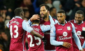 Aston Villa’s Joleon Lescott celebrates with team mates after scoring their first goal