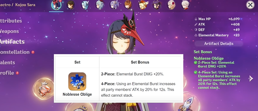 The best four-piece set for Kujou Sara is Noblesse Oblige. With the four-piece set bonus, you can get an attack buff for all the party members, and not to mention, Noblesse Oblige is the best artifact for any support character in the game. Other than the Noblesse artifact, you can even try the four-piece Emblem of Severed Fate and Thundersoother.