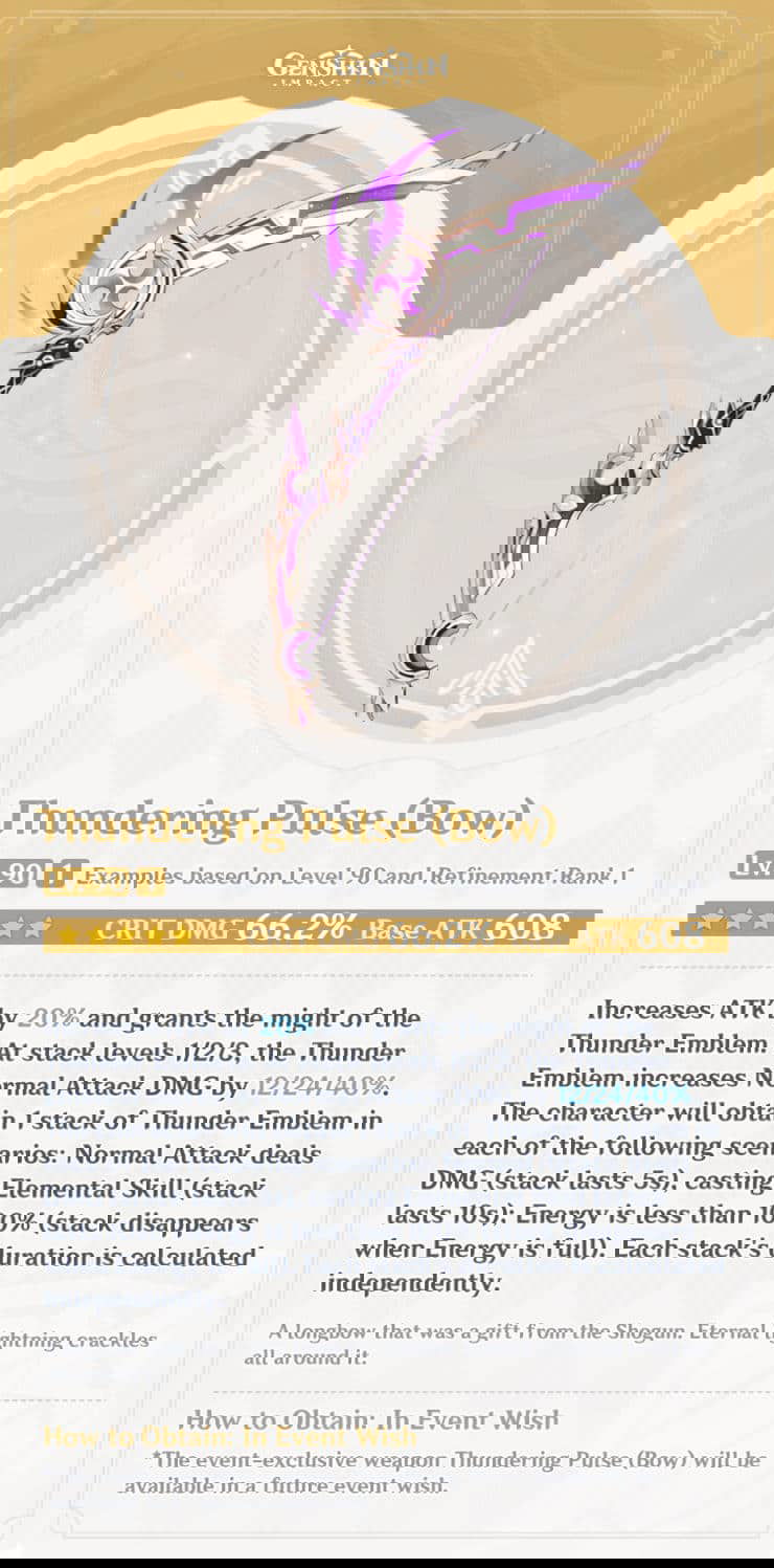 Naturally, the new five-star weapon Thundering Pulse is the signature weapon of Yoimiya. It has a high base attack and even its passive suits perfectly for Yoimiya. Furthermore, it also has sub-stat of CRIT DMG, which can overcome the lack of CRIT DMG, you need for her while ascending her.