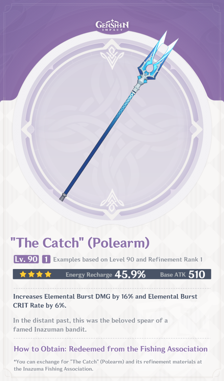 After collecting a certain amount of fishes you can exchange them to get the Catch and its refinement materials for free from the fishing association. It provides you additional energy recharge rather than the elemental mastery; however, with the four-piece set bonus of Emblem artifact, you can get some additional burst damage.
