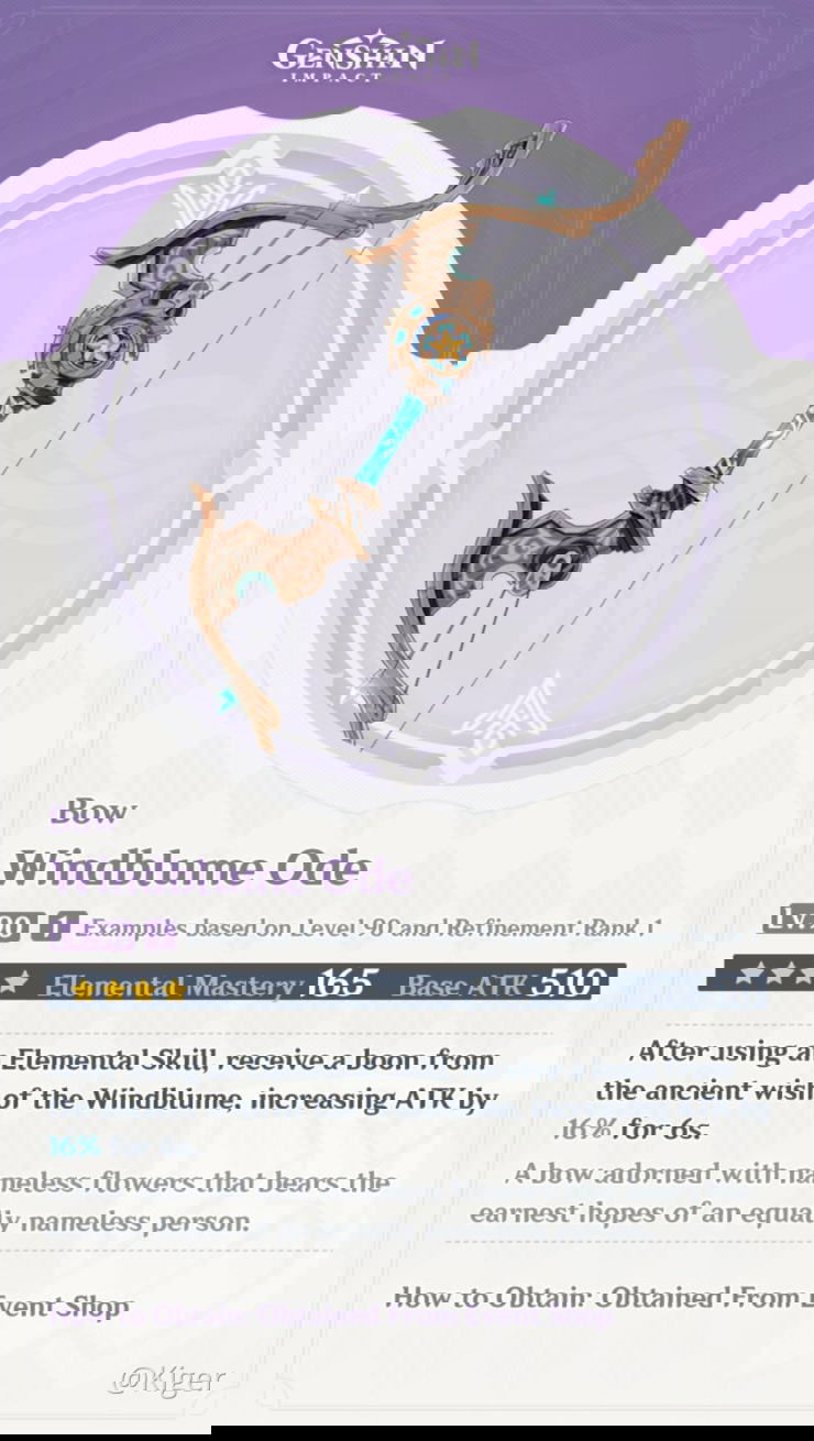 miHoYo announced that during the Windblume festival players will get a new event exclusive four star weapon. This new four-star weapon would be another bow, Windblume Ode, and can be refined to be up-to level 5 for free. The sub-stat it will provide would be Elemental Mastery, and Venti needs exactly this attribute to overpower the enemies.