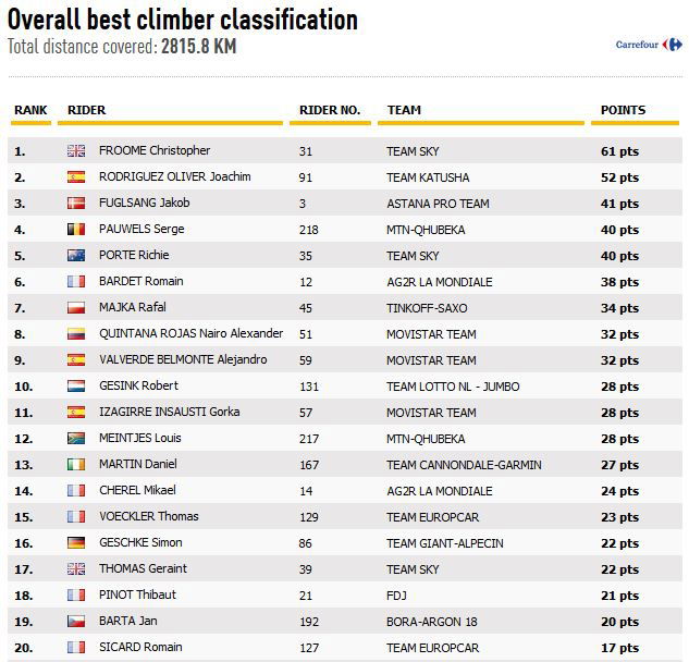 Mountain Climbing Classification after Stage 17. Image Courtesy of Tour de France website,