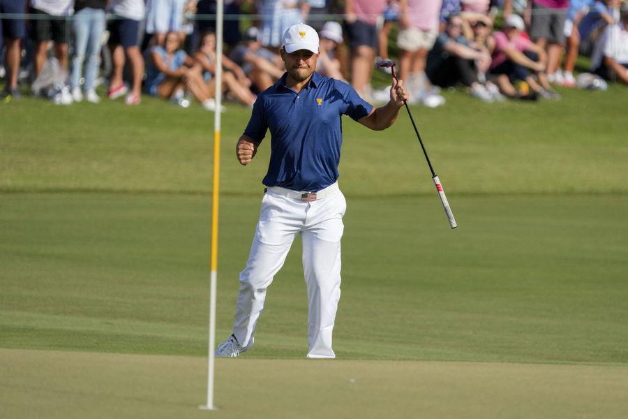 Sep 24, 2022; Charlotte, North Carolina, USA; Team USA golfer Xander Schauffele celebrates after making his putt on the 15th green during the four-ball match play of the Presidents Cup golf tournament at Quail Hollow Club. Mandatory Credit: Jim Dedmon-USA TODAY Sports
