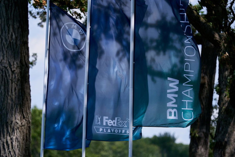 OLYMPIA FIELDS, IL – AUGUST 27 A detail view of the BMW Championship logo is seen on a flag during the first round of the BMW Championship on the North Course at Olympia Fields Country Club on August 27, 2020 in Olympia Fields, Illinois. (Photo by Robin Alam/Icon Sportswire via Getty Images)