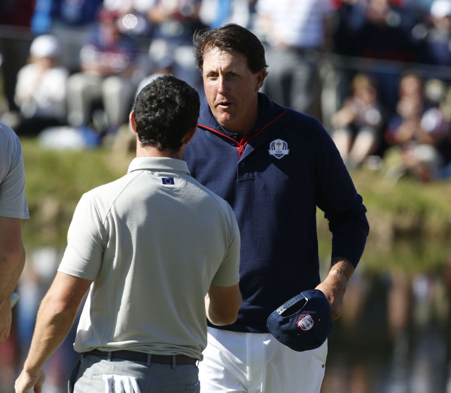 Oct 1, 2016; Chaska, MN, USA; Phil Mickelson shakes hands with Rory McIlroy on the 16th hole during the Day 2 morning matches for the 2016 Ryder Cup at Hazeltine National Golf Club in Chaska, MN. (Photo by Brian Spurlock/Icon Sportswire) GOLF: OCT 01 PGA Golf Herren – Ryder Cup – Day Two PUBLICATIONxINxGERxSUIxAUTxHUNxRUSxSWExNORxONLY Icon1610011002