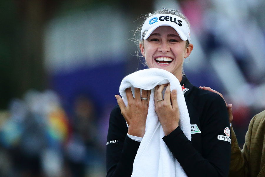 NEW TAIPEI CITY, TAIWAN – NOVEMBER 03: Nelly Korda of United States of America reacts after she wins the Taiwan Swinging Skirts LPGA Presented By CTBC at Miramar Golf Country Club on November 3, 2019 in New Taipei City, Taiwan. (Photo by Suhaimi Abdullah/Getty Images)