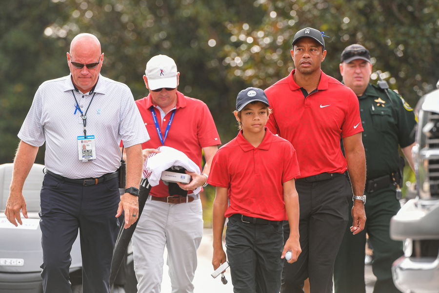 ORLANDO, FL – DECEMBER 19: Tiger Woods and his son, Charlie Woods, arrive to the course during the final round of the PGA TOUR Champions PNC Championship at Ritz-Carlton Golf Club on December 19, 2021 in Orlando, Florida. (Photo by Ben Jared/PGA TOUR via Getty Images)