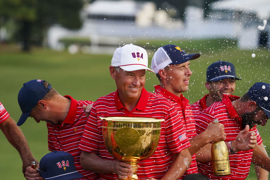Sep 25, 2022; Charlotte, North Carolina, USA; Team USA golfer Tony Finau (left) pours champagne into the trophy held by Team USA captain Davis Love III (right) during the singles match play of the Presidents Cup golf tournament at Quail Hollow Club. Mandatory Credit: Peter Casey-USA TODAY Sports