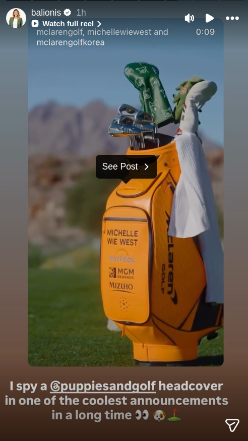 Balionis spotted something special on a headcover in McLaren’s promotional video featuring Wie West. A known advocate for puppies and dogs—and founder of the nonprofit Puppies & Golf—Balionis noticed the one with printed puppies. On her Instagram story, Balionis wrote, “I spy a @puppies&golf headcover in one of the coolest announcements in a long time 👀🐶⛳.”