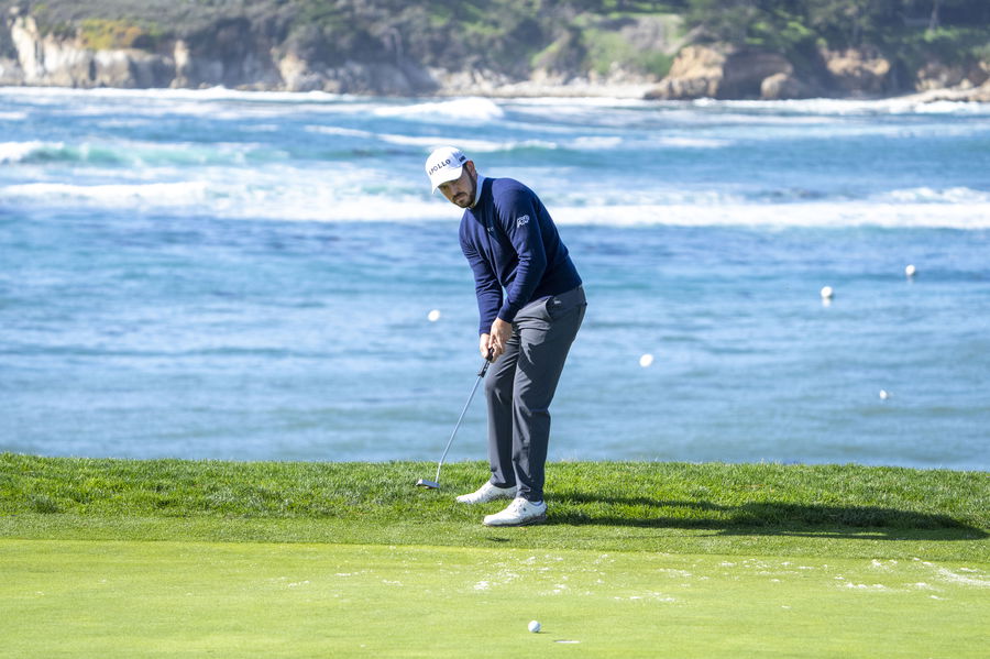 February 2, 2024; Pebble Beach, California, USA; Patrick Cantlay putts on the fifth hole during the second round of the AT&T Pebble Beach Pro-Am golf tournament at Pebble Beach Golf Links. Mandatory Credit: Kyle Terada-USA TODAY Sports