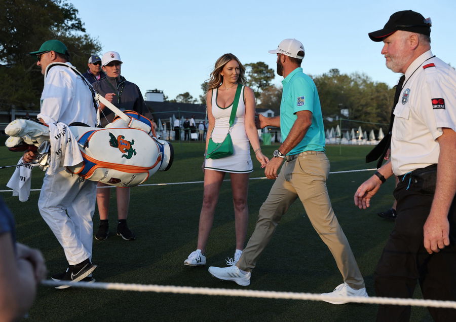 Golf – The Masters – Augusta National Golf Club – Augusta, Georgia, U.S. – April 7, 2022 Dustin Johnson of the U.S. and Paulina Gretzky are seen during the first round REUTERS/Mike Blake