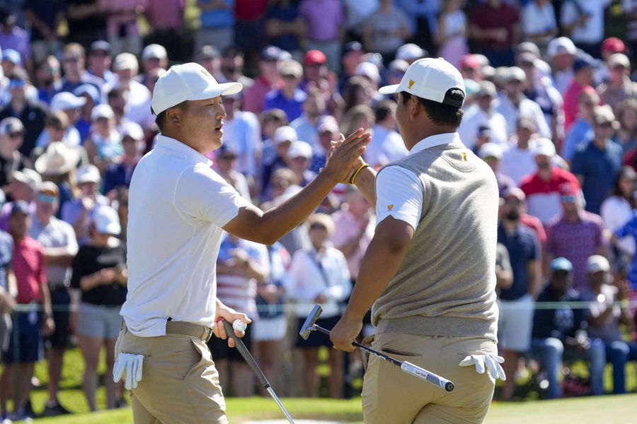Sep 24, 2022; Charlotte, North Carolina, USA; International Team golfer K.H. Lee (left) and golfer Tom Kim (right) celebrate on the 15th green during the foursomes match play of the Presidents Cup golf tournament at Quail Hollow Club. Mandatory Credit: Jim Dedmon-USA TODAY Sports