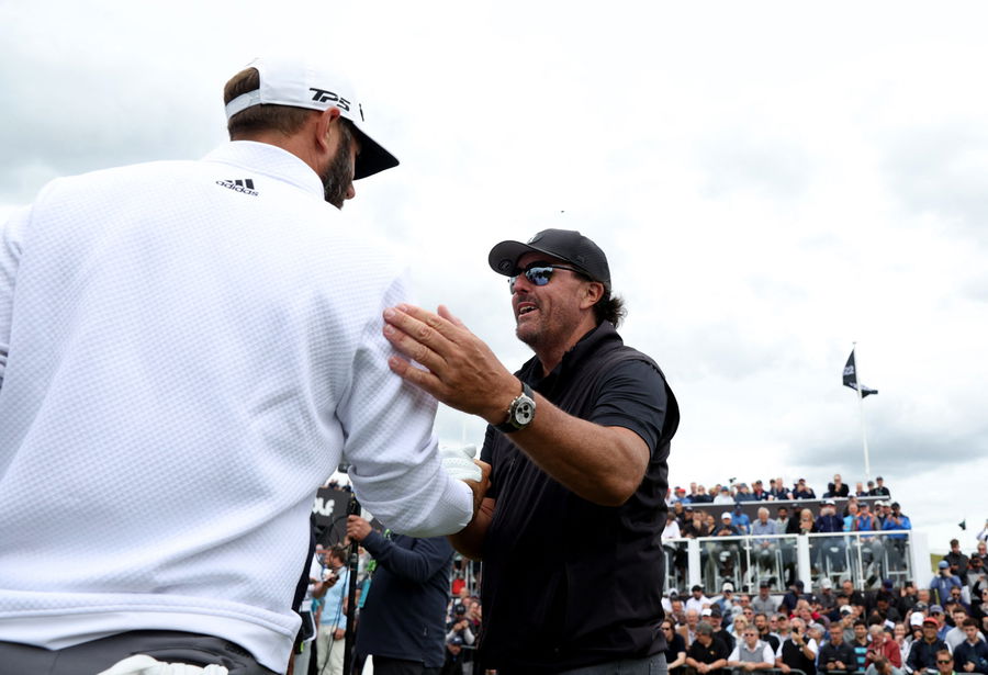 Golf – The inaugural LIV Golf Invitational – Centurion Club, Hemel Hempstead, St Albans, Britain – June 9, 2022 Team 4 Aces’ Dustin Johnson of the U.S. with team Hy Flyers Phil Mickelson of the U.S. on the 1st during the first round Action Images via Reuters/Paul Childs