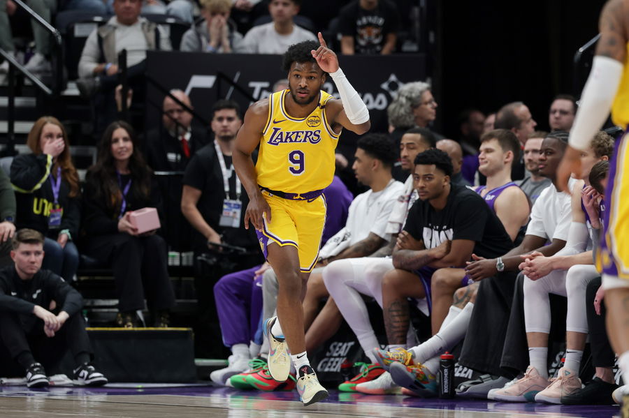Feb 12, 2025; Salt Lake City, Utah, USA; Los Angeles Lakers guard Bronny James (9) celebrates after making a three point basket during the second half against the Utah Jazz at Delta Center. Mandatory Credit: Chris Nicoll-Imagn Images