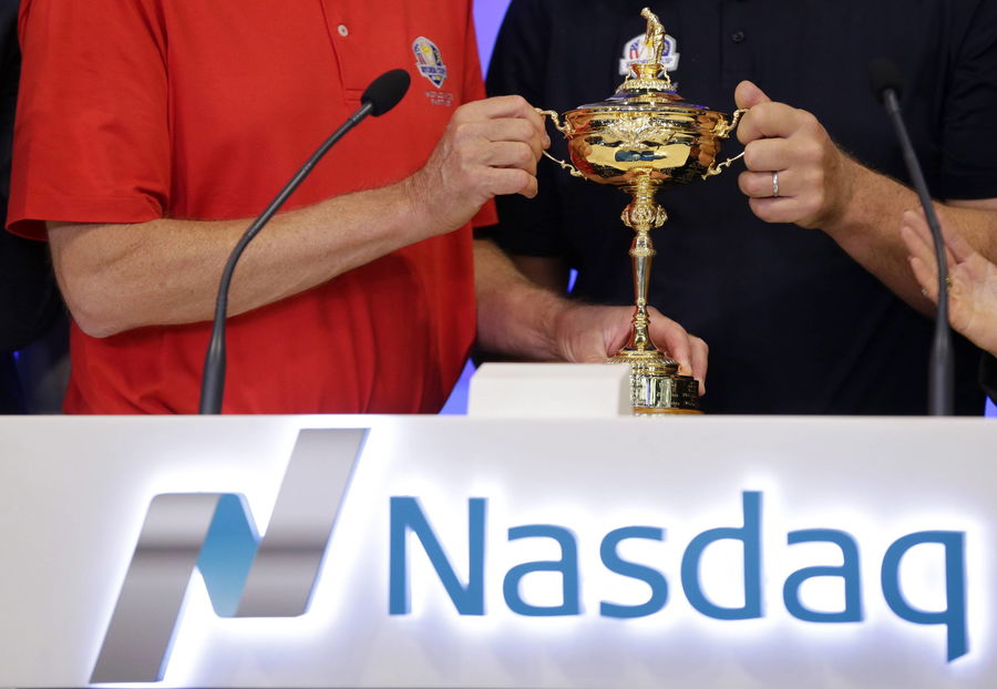 Images the Day Sports Ryder Cup Captains Davis Love III and Darren Clarke Hold The The Ryder Cup Trophy when They Ring The Opening Bell AT The Nasdaq in Times Square in New York City ON April 28, 2016 PUBLICATIONxINxGERxSUIxAUTxHUNxONLY JohnxAngelillo