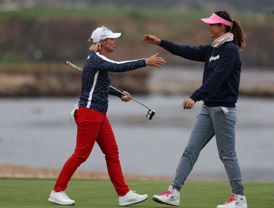 Jul 7, 2023; Pebble Beach, California, USA; Annika Sorenstam (left) and Michelle Wie West hug on the eighteenth green after they finished a round during the second round of the U.S. Women’s Open golf tournament at Pebble Beach Golf Link. Mandatory Credit: Kiyoshi Mio-USA TODAY Sports